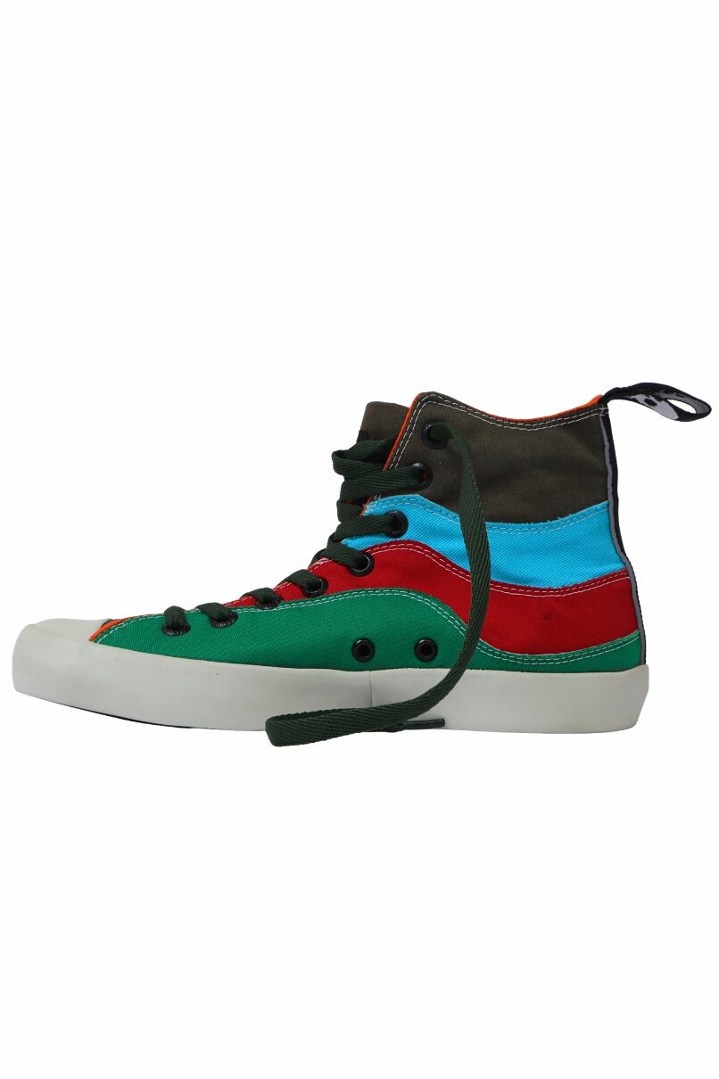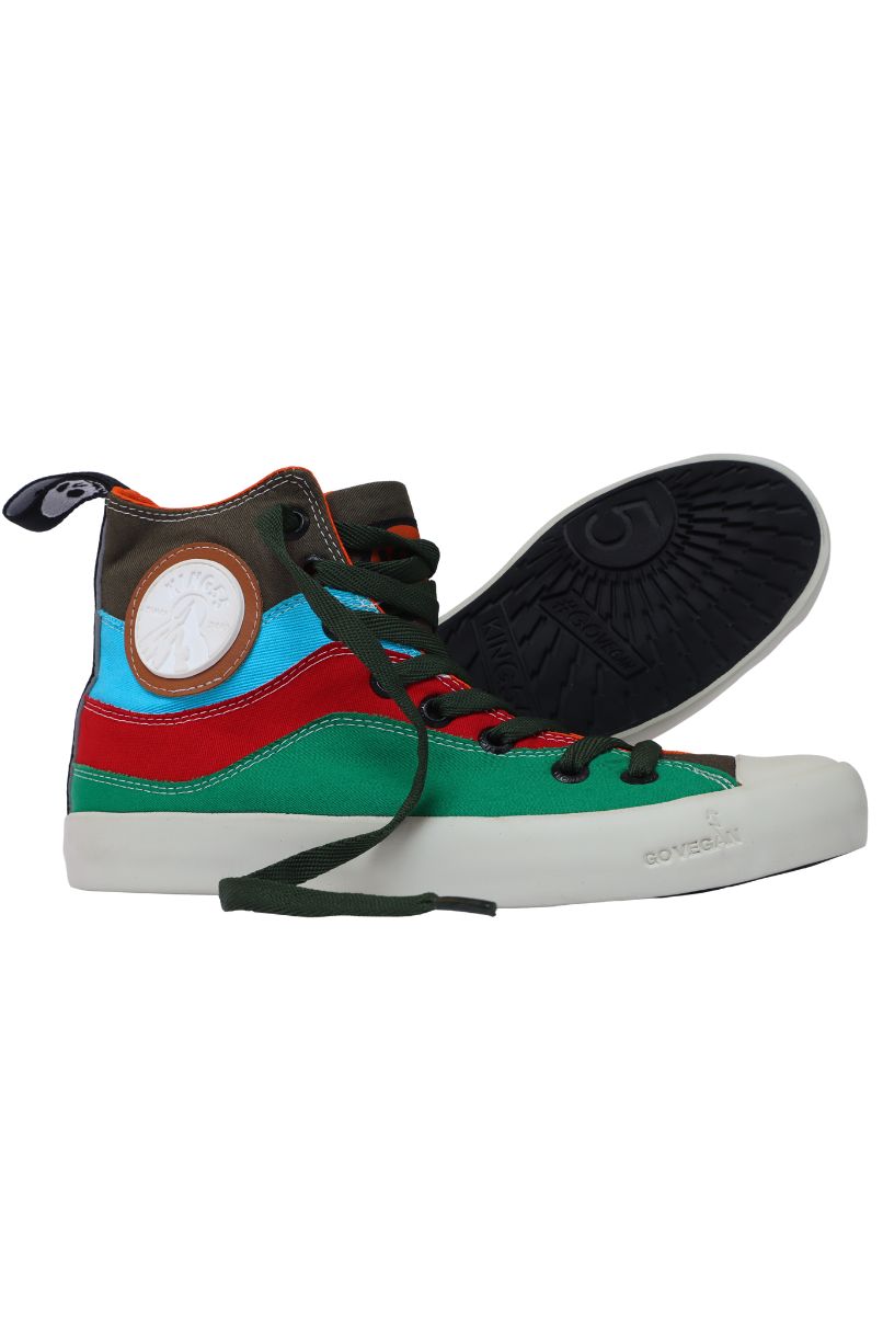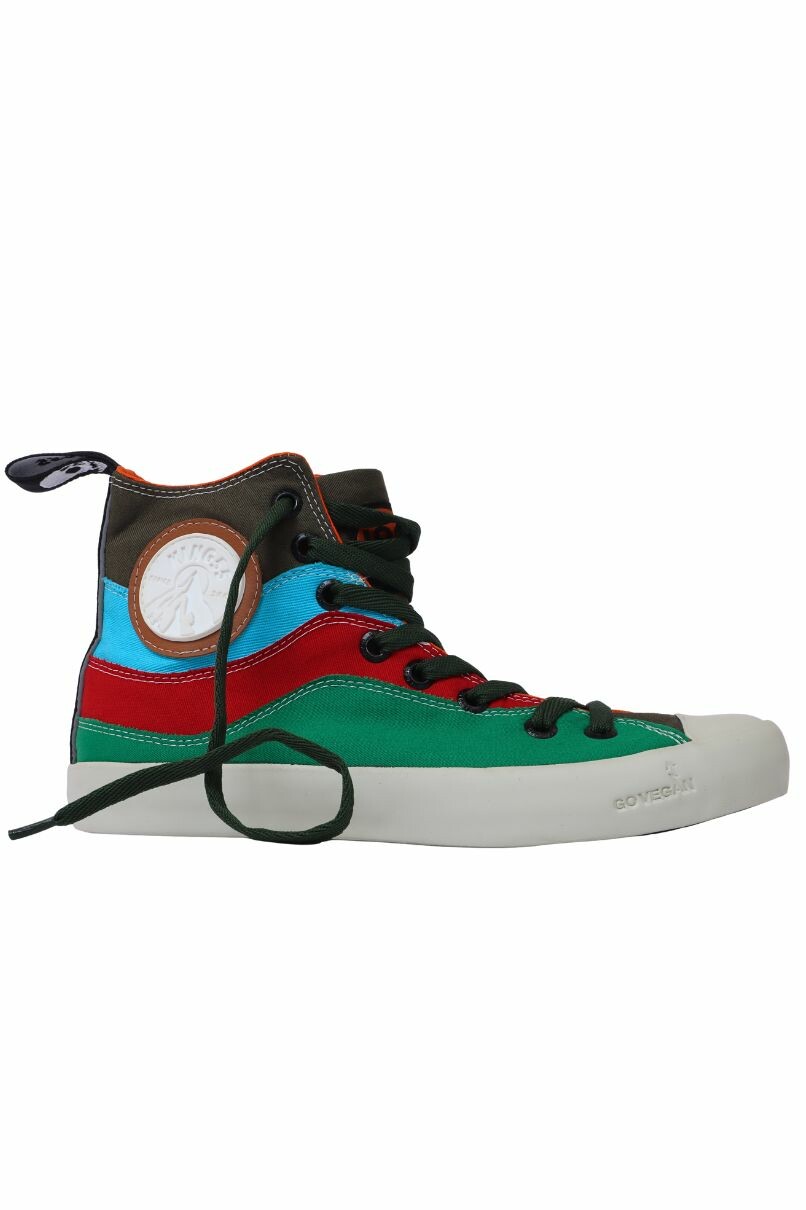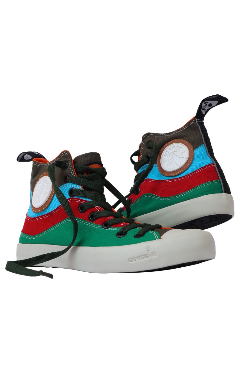 Tênis Vegano Quadricolor Edição Especial nas cores Verde Bandeira, Vermelho, Azul Piscina e Verde Militar, cano alto. Confeccionado em tecido de algodão - 100% livre de Crueldade Animal.