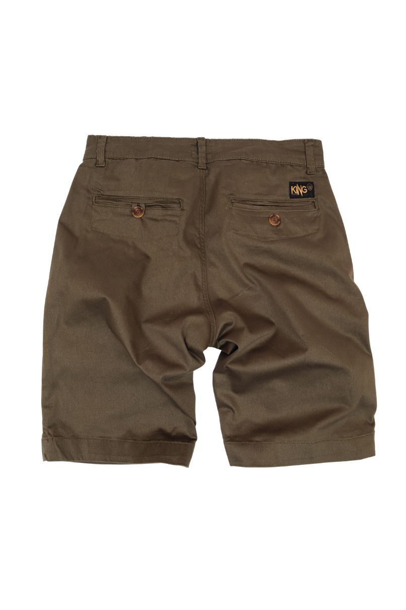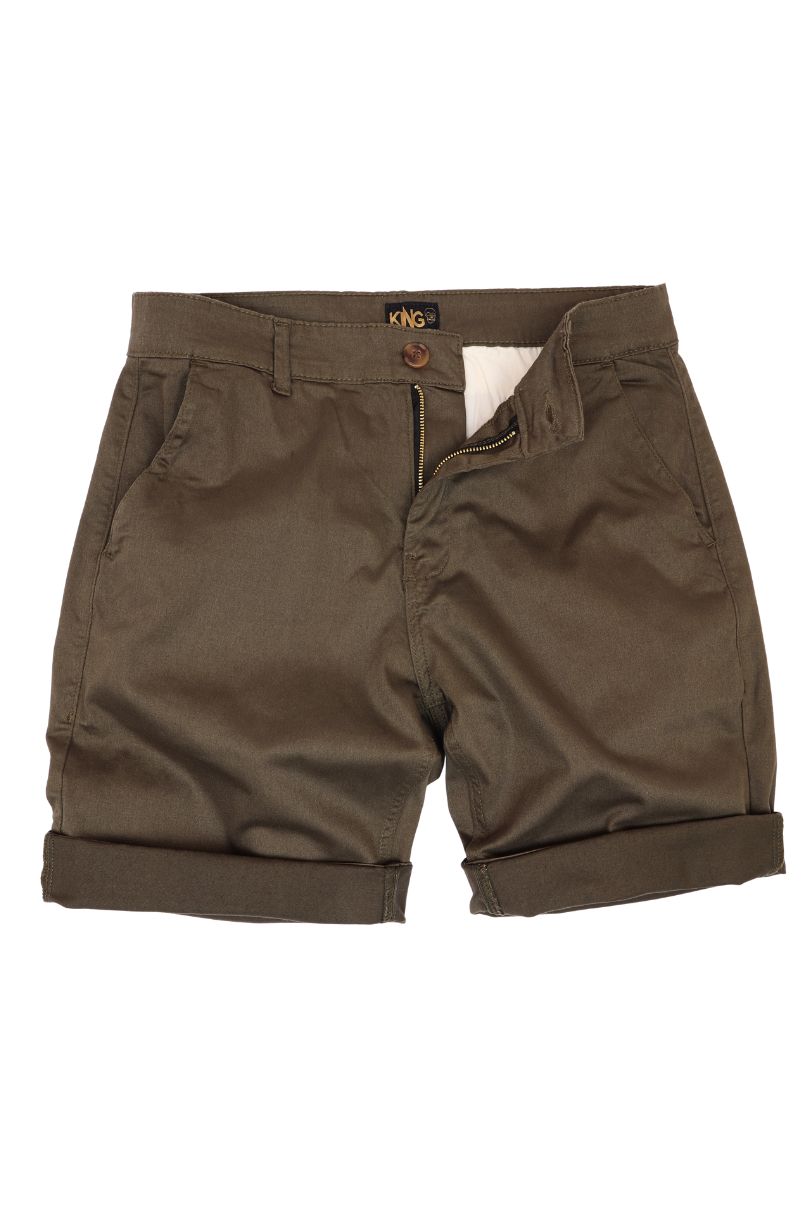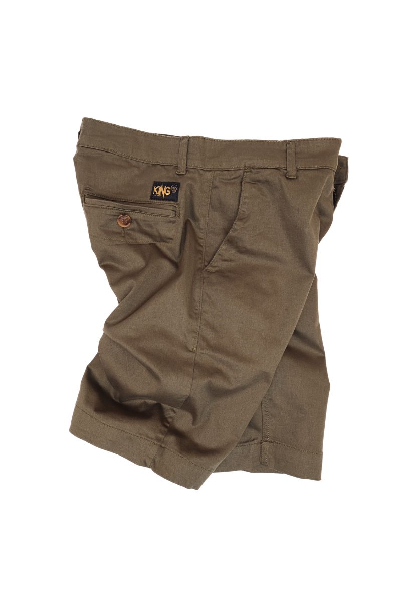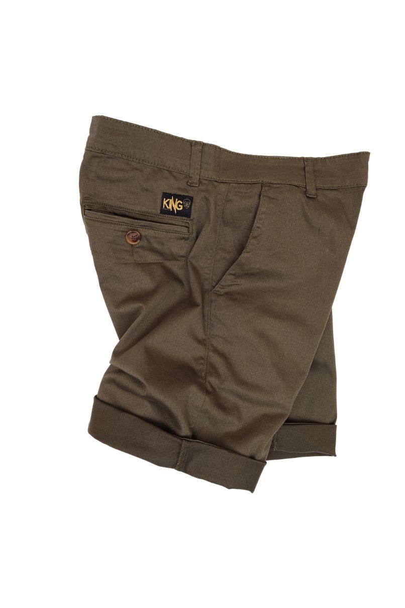 Bermuda de sarja Verde Militar, cintura intermediária, bolsos faca, bolsos traseiros embutido com fechamento em botão. Fechamento em zíper.