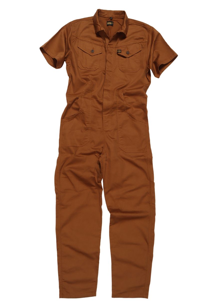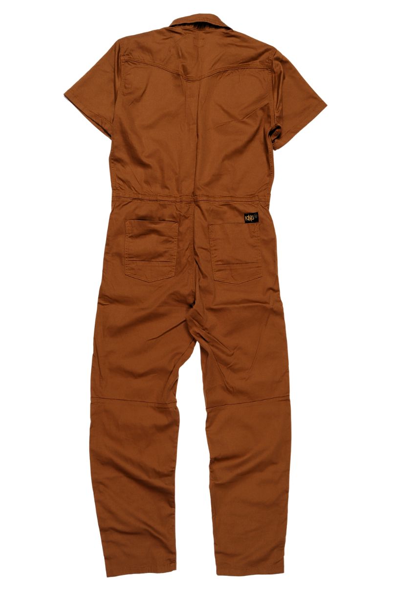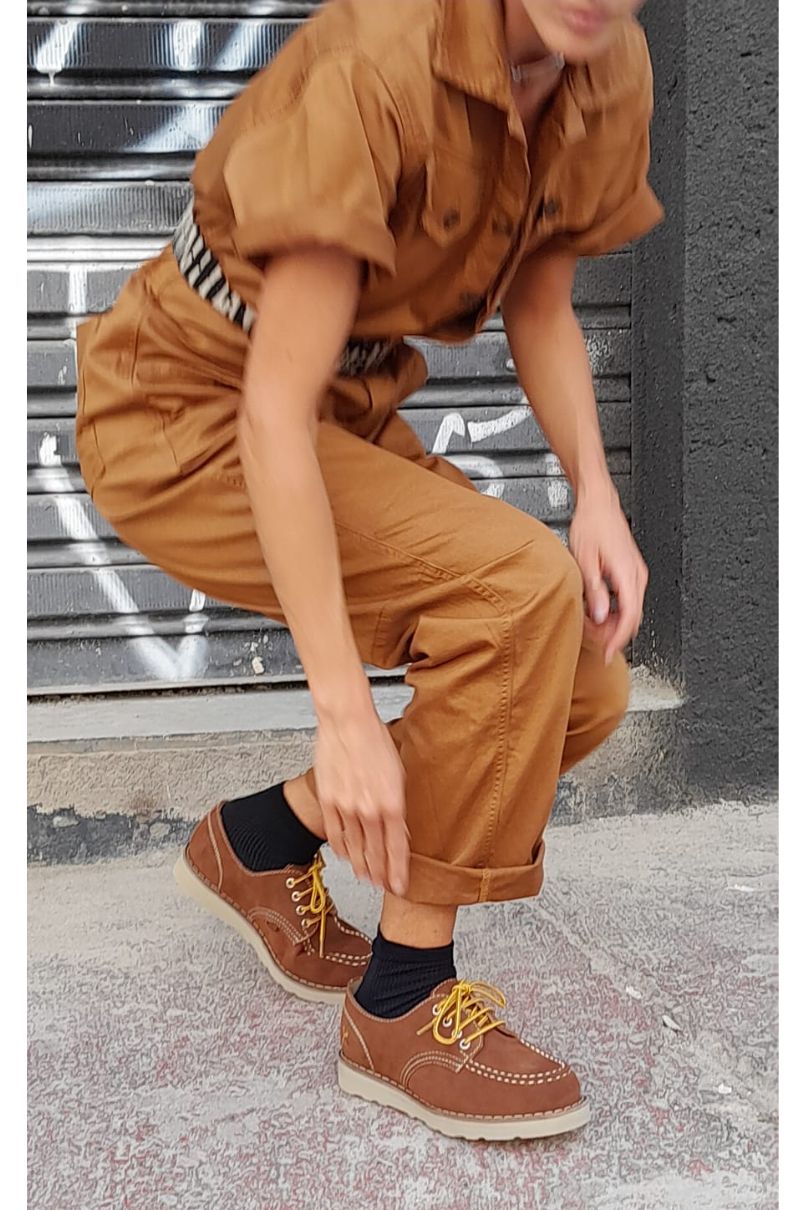 Macacão Estilo Operário Unissex em Sarja Conhaque, com fechamento frontal em botão, bolsos frontais e traseiros.