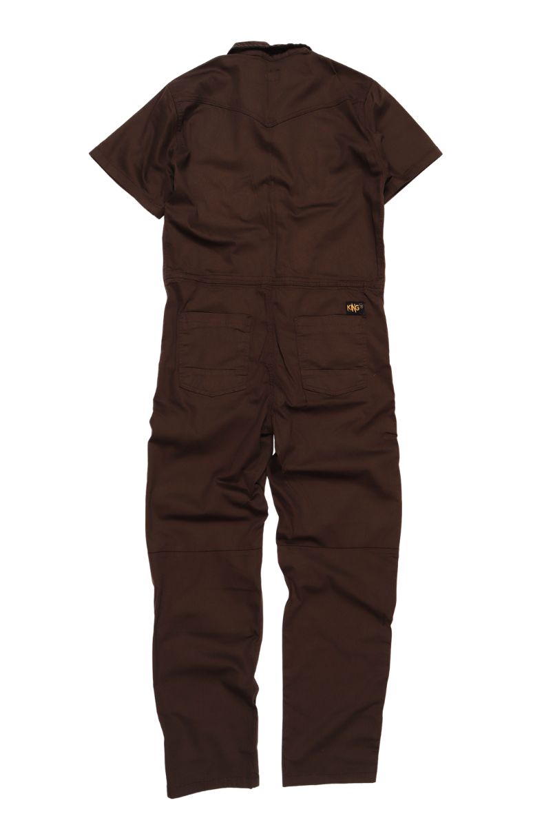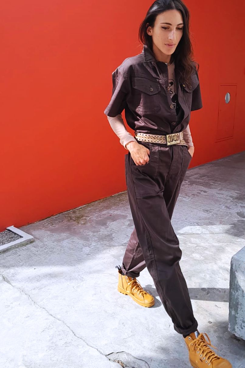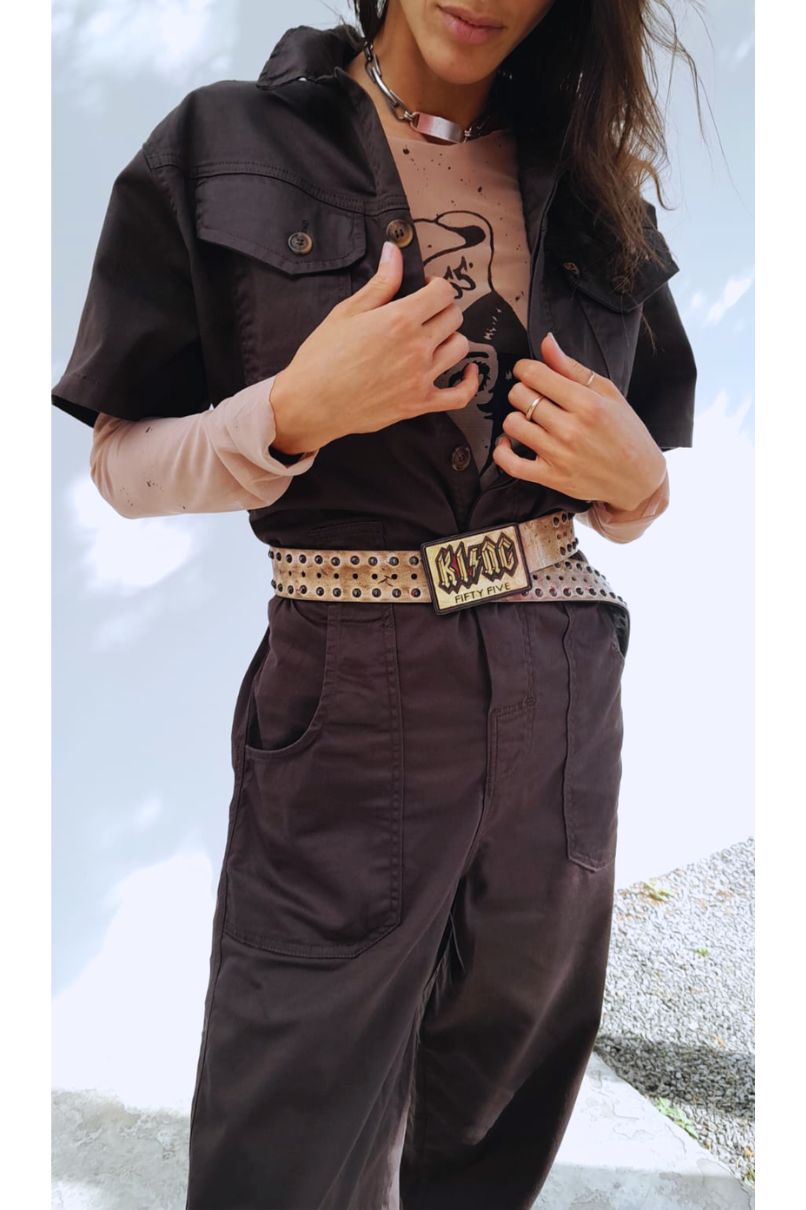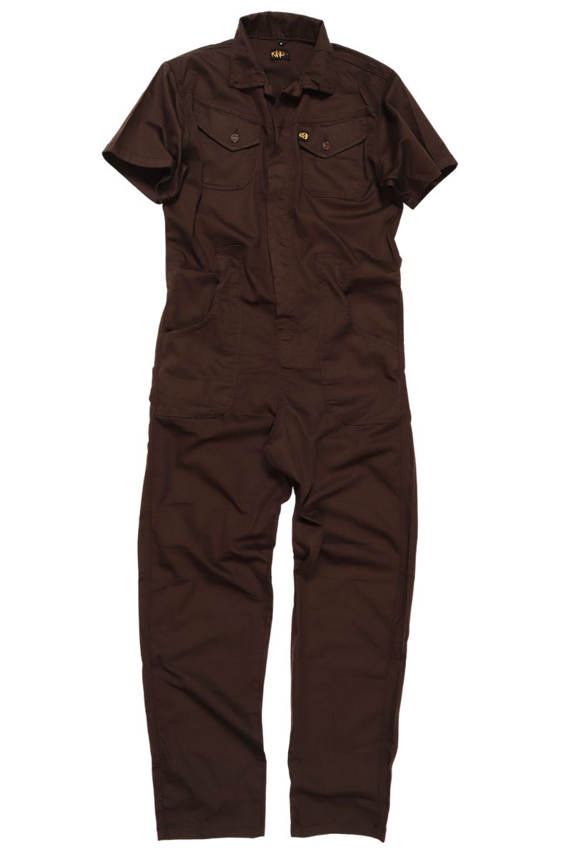 Macacão Estilo Operário Unissex em Sarja Conhaque, com fechamento frontal em botão, bolsos frontais e traseiros.